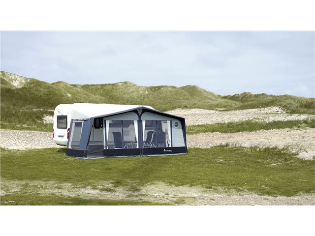 Myggenet i begge gavle og i fronten, markisestrimmel i gavlen.